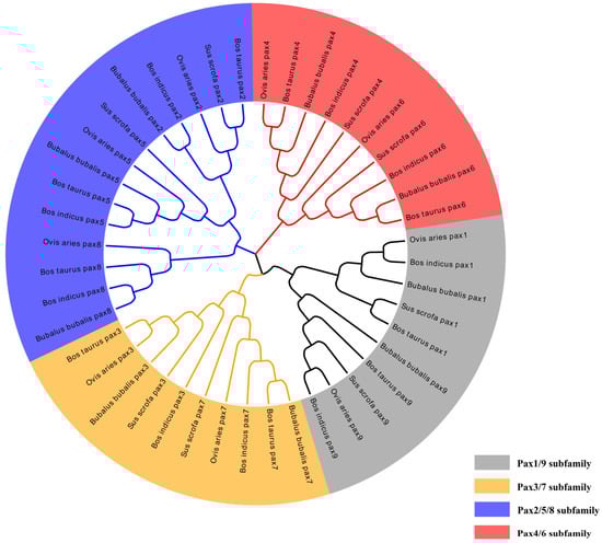Using the hmmer tool, nine Pax genes were found in the whole-genome data of domestic cattle, the Zebu, buffalo, and sheep, and eight Pax family members except Pax8 were found in pigs, with a total of 44 genes. According to the evolutionary relationships, these genes can be divided into four subfamilies, namely the Pax3/7 subfamily, Pax4/6 subfamily, Pax1/9 subfamily, and Pax2/5/8 subfamily. The selective evolutionary analysis of the five animals showed that domestic cattle were more homologous to buffalo and the Zebu than other domestic animals most of the time (Figure 1).