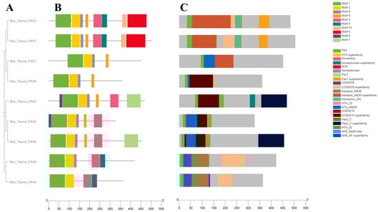 B. taurus Pax gene family: (A) phylogenetic relationship, (B) motif orientation, and (C) conserved domain distribution.