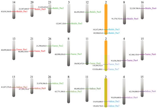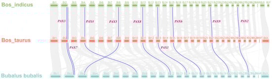 Co-linearity analysis of the Pax gene family in B. taurus, B. indicus, and B. bubalis.
