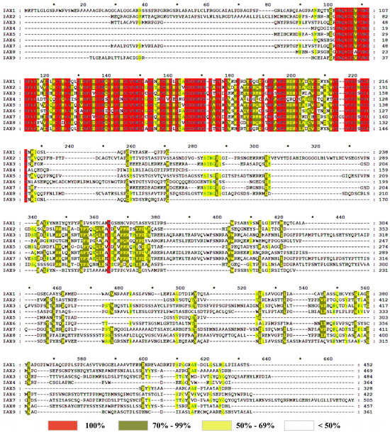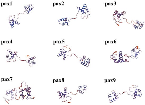 The ClustalW function of MEGA11 was applied to compare the protein sequence of the Pax gene in domestic cattle and the results were imported into GeneDoc to produce the following results (Figure 6). The red area in the figure below indicates that the comparison rate is 100%, the orange area has a comparison rate of 70% to 99%, the yellow area has a comparison rate of 50% to 69%, and the colorless area is less than 50%. The comparison results show that nine Pax protein sequences had high consistency in the 100–220 region and were highly conserved in this region. It was speculated that the conserved domain of the Pax family was located in this region, which was related to the function of the Pax protein.