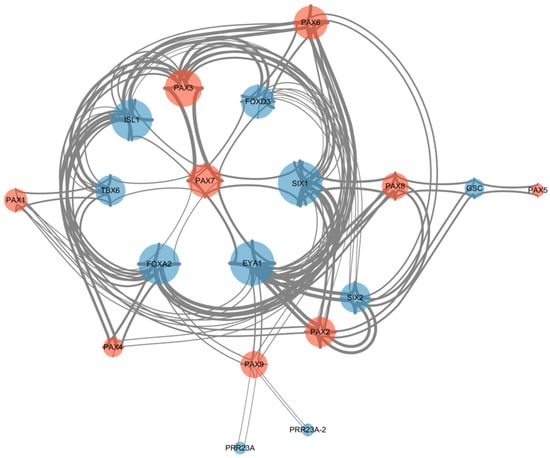 The protein interaction network of Pax gene was constructed using the online website STRING (https://cn.string-db.org/) (assessed on 22 May 2024) to explore the interactions among the proteins encoded by the Pax gene family and the results were imported into the software for beautification.