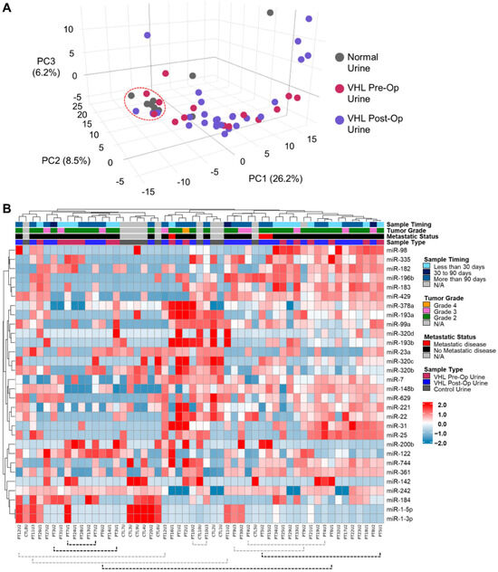 Differential miRNA expression in VHL-associated ccRCCs. (A) A 3D PCA analysis of the urinary exosome-derived miRNAs from 10 normal controls and 43 VHL patient samples, including 15 preoperative and 28 postoperative urine samples. A cluster of the majority of normal controls is indicated by a dashed red circle. (B) Heatmap representation and dendrogram for the 30 most variable miRNAs across the cohort of samples. The type and timing of procurement for each sample, along with the patient’s tumor grade and metastatic status, are shown. Paired samples representing both pre- and postoperative samples are highlighted with black dashed brackets, and pairs representing multiple postoperative samples are highlighted with gray dashed brackets.
