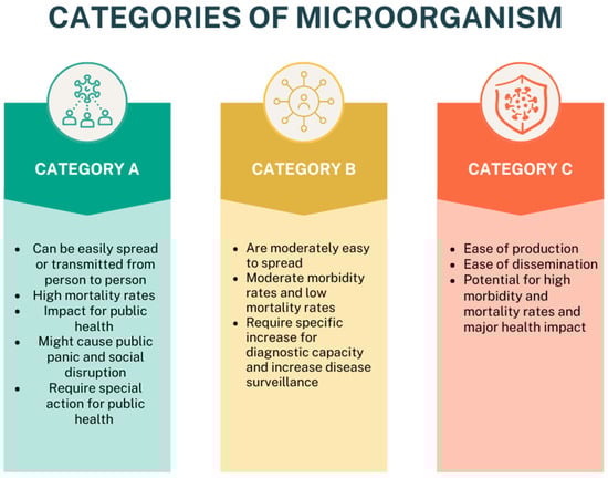 Microorganisms could be classified into three categories [6]: (1) Category A, agents that pose the highest risk to public and security health; (2) Category B, agents with moderate morbidity and low mortality rates; and (3) Category C, agents with high morbidity and mortality rates and ease of dissemination (Figure 2) [6].
