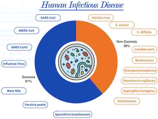 Distribution of transmission of infectious diseases in humans. In human infectious diseases, transmission through zoonosis has a higher impact (61%) and includes coronaviruses, influenza viruses, West Nile virus, Yersinia pestis, and Sporothrix brasiliensis. On the other hand, non-zoonotic transmissions have a lower impact rate of 39%, including Variola virus, Staphylococcus aureus, Clostridium difficile, Candida auris, Blastomyces, Emergomyces species, Rasamsonia argillacea, Trichophyton indotinae, Aspergillus fumigatus, and Schistosoma species (created with Canva.com).