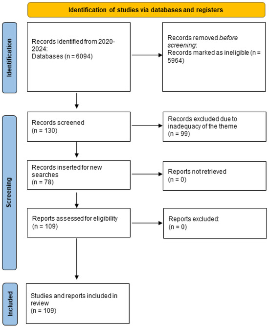 The initial screening produced 6094 studies (Figure 4). One hundred and thirty studies were analyzed, and a total of thirty-one studies initially met the inclusion criteria, including case–control clinical studies, clinical trials, randomized trials, meta-analyses, and systematic reviews. Seventy-eight more articles were subsequently included. The filtering process is depicted in Figure 4, which provides a summary of the included studies.