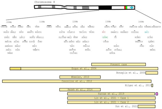 - Concolino, D.; Iembo, M.A.; Moricca, M.T.; Rapsomaniki, M.; Marotta, R.; Galesi, O.; Fichera, M.; Romano, C.; Strisciuglio, P. A de novo 8q22.2-24.3 duplication in a patient with mild phenotype. Eur. J. Med. Genet. 2012, 55, 67–70. [Google Scholar] [CrossRef] [PubMed]