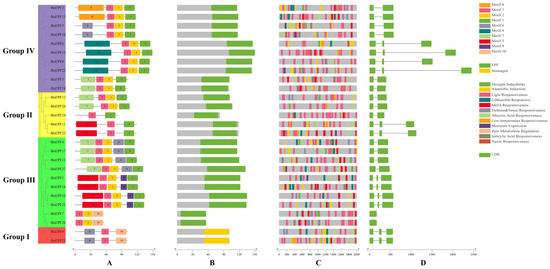 To examine the phylogenetic relationships among EPF proteins across diverse plant species, 11 A. thaliana EPF proteins, 27 B. napus EPF proteins, 14 B. rapa EPF proteins, and 16 B. oleracea EPF proteins were selected to generate a phylogenetic tree (Figure 2 and Supplementary File S4). The phylogenetic relationships among the EPF proteins were studied. The findings indicated that the EPF proteins clustered into four distinct clades (I, II, III, and IV). The distribution of the evolutionary clades varied significantly. The most abundant branches were Group III and Group IV, each with 24 members. Group III includes three AtEPFs, ten BnEPFs, five BrEPFs, and six BoEPFs, while Group IV includes four AtEPFs, ten BnEPFs, five BrEPFs, and five BoEPFs. Next was Group II, which has fifteen members, including three AtEPFs, five BnEPFs, three BrEPFs, and four BoEPFs. Group I had the fewest members, with one AtEPF, two BnEPFs, one BrEPF, and one BoEPF. It was worth noting that all branches contain EPF proteins from B. napus, B. rapa, B. oleracea, and A. thaliana. This distribution highlights their close genetic relationship.