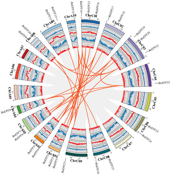 Synteny analysis among BnEPFs. Gray lines denote all synteny blocks between each chromosome, while thick red lines indicate duplicated pairs of EPFs. The circles in this Figure represent, from innermost to outermost, the ratio of unknown bases (N ratio), gene density, GC ratio, GC skew, and chromosome length of the B. napus genome. Chromosome names are labeled at the bottom of each chromosome, and the positions of BnEPFs are indicated accordingly.