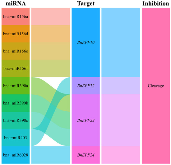 The CDS sequences of BnEPFs were submitted to the psRNATarget website (https://www.zhaolab.org/psRNATarget/analysis?function=2/, accessed on 26 April 2024) for analysis [36], in combination with miRNA sequences of B. napus available on the same site. This facilitated the investigation of targeting relationships between miRNAs and BnEPFs. Data visualization was executed by the alluvial plot tool on the Bioinformatics website (https://www.bioinformatics.com.cn/plot_basic_alluvial_plot_017, accessed on 26 April 2024).
