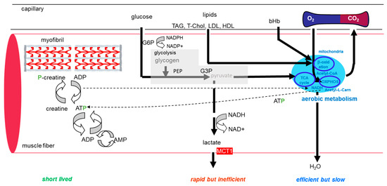 Moreover, our investigation did not identify the suspected genetic influence on the transport of ketone metabolism due to the relatively short impact of exercise on subjects after an overnight fast. Genotype and exercise interaction effects on ‘empty’ high-energy phosphate, AMP, and phosphocreatine suggested that compensatory reactions involving myokinase, adenylate kinase, or AMP deaminase are indicated for future studies. Importantly, we identified an association between rs1049434 and variability in the studied knee extensor muscle composition in terms of slow-type fibers, which are quantitatively related to exercise-affected metabolic substrates, foremost glycogen, and TAG. In turn, post-exercise concentrations of the latter also correlated with the mitochondrial COX4I1/GAPDH mRNA ratio. Conversely, the concentrations of a few metabolites not associated with the studied MCT1 genotype, i.e., bHb and T-Chol, corresponded to perfusion indices (i.e., capillarization). This highlighted that the studied nonsynonymous MCT1 gene polymorphism may only partially overcome the structural limitations on the trans-capillary import of substrates for aerobic muscle metabolism during exercise. The MCT1 gene polymorphism appeared to play a significant role in selecting glycogen and triacylglycerol (TAG) for muscle metabolism during exercise, although this did not result in major differences in respiration during the type of exercise performed.