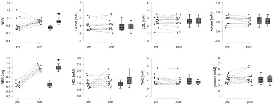 One-legged exercise induces changes in blood gases and metabolites. Spaghetti and box plots of blood metabolite and blood gas values before and 30 min after exhaustive one-legged ramp exercise (n = 22). RER 2-leg corresponds to the respiration exchange ratio during two-legged cardiopulmonary exercise testing. *, p < 0.05 vs. pre-test, repeated-measures ANOVA with post hoc Tukey/Holm test.