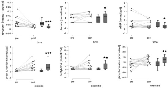 Metabolic changes in the knee extensor muscle are induced by one-legged exercise to exhaustion. Spaghetti and box plots of the values for muscle metabolites for the 22 assessed subjects pre- vs. post-exercise in the exercised leg. *, **, and *** denote p < 0.05, <0.01, and <0.001, respectively. Repeated ANOVA with post hoc test of Tukey/Holm.