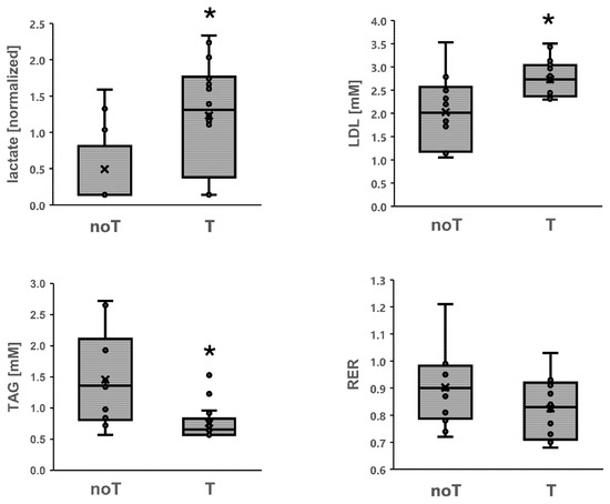 Metabolites demonstrating genotype differences, irrespective of exercise. Box plots for muscle lactate concentration in M. vastus lateralis, LDL, and TAG in blood, as they demonstrate different levels in T-allele carriers (n = 15) than in non-carriers of rs1049434 (n = 7), irrespective of exercise. * p < 0.05 vs. AA. ANOVA with post hoc test of Tukey/Holm. RER: p = 0.059.