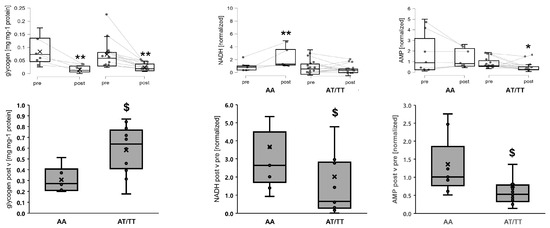 Muscle metabolites demonstrating MCT1 genotype differences in exercise-induced changes. Combined spaghetti and box plots for the concentrations of glycogen, NADH, and AMP in M. vastus lateralis, and LDL and TAG in blood, which demonstrated an interaction between exercise and rs1049434, i.e., the studied 15 carriers and 7 non-carriers of the T-allele. * and ** denote p < 0.05 and <0.01 vs. pre-test for the respective situation. $ denotes p < 0.05 vs. AA. ANOVA with post hoc test of Tukey/Holm.