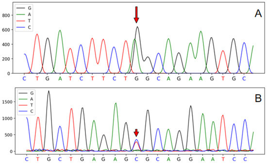 The peak map of mutated SNPs in MSTN and Callipyge of Tibetan sheep 1. 1 The sequences were subsequently analyzed utilizing the DNAMAN software. The identified location of the red arrow is the mutation site. (A) MSTN mutations marked by the red arrows are located in exon 2 of MSTN A592G (rs410961001). (B) SNP mutation C232T was identified in Callipyge (AF401294) at the sites marked with the red arrow.