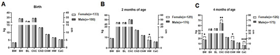 The results revealed a statistically significant relationship between sex and various growth traits at different ages, including HW at 2 months, BW and ChW at 4 months (p < 0.05), and ChC and CaC at 4 months (p < 0.01). Nevertheless, no significant associations were found between sex and other growth traits at birth, 2 months, or 4 months of age (p > 0.05; Figure 2).