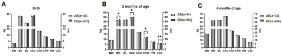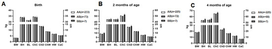 The association of SNPs in Callipyge with Tibetan sheep’s growth traits 1. 1 (A) Association analysis of SNPs in Callipyge and growth traits in Tibetan sheep at birth. (B) Association analysis of SNPs in Callipyge and growth traits in Tibetan sheep at 2 months of age. (C) Association analysis of SNPs in Callipyge and growth traits in Tibetan sheep at 4 months of age. AA represents the wild-type genotype; AB represents the heterozygous mutant genotype; BB represents the homozygous mutant genotype; BW stands for body weight; BL stands for body length; BH stands for body height; ChC stands for chest circumference; ChD stands for chest depth; ChW stands for chest width; HWstands for hip width; CaC stands for cannon circumference.