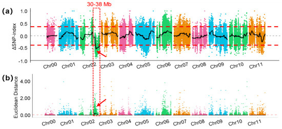BSA mapping of FW in watermelon. (a) Distribution of Δ(SNP-index) across the genome. (b) Distribution of Euclidean distance (ED) across the genome. The red dotted box and arrow represent QTL identified by the two methods.