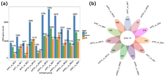 Analysis of differentially expressed genes between sh14-11 and N14 in 11 pairs of tissues, including 3 stages of flower (F0, F1, F2), 4 stages of fruit pulp (R7, R15, R23, R31) and 4 stages of fruit peel (P7, P15, P23, P31). (a) Number of differentially expressed genes in 11 corresponding pairs of tissues between parents; (b) overlapping differentially expressed genes in 11 corresponding pairs of tissues.