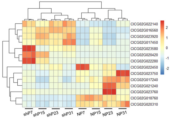The expression patterns of these genes in the parents are different across the four stages of fruit peel (Figure 8). Among them, ClCG02G022140, ClCG02G023920, ClCG02G016560, ClCG02G017450, ClCG02G023580, ClCG02G022280 and ClCG02G020420 exhibit high expression in sh14-11, while ClCG02G023750, ClCG02G022450, ClCG02G017240, ClCG02G018760, ClCG02G020310, ClCG02G021240 and ClCG02G023760 show elevated expression in N14.