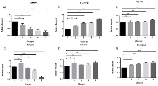 Analysis of gene expression of AMPK, FOXP2, WNT3, NPY2R, NHPH4, and PLXNA1 at different feeding stages (A–F respectively). The data indicate the fold change in relative expression at different stages compared to the control condition (stage 1—zero diet), using the qRT-PCR technique. The numbers 1–5 represent the five predefined feeding stages from which the newborn samples were collected: (1) Zero diet; (2) Partial enteral feeding; (3) Full enteral feeding; (4) Partial oral feeding; (5) Full oral feeding. Analyses were performed using one-way ANOVA test. Error bars represent the standard deviation. Asterisks indicate the level of significance (* p < 0.05; ** p < 0.01; *** p < 0.001; **** p < 0.0001).