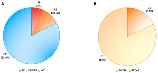 BRCA1 and BRCA2 mutation analysis of 860 breast cancer patients. (A) Distribution of pathogenic variants (PVs) (red), conflicting interpretations of pathogenicity (CIP) or variants of uncertain significance (VUS) (orange) and WT (blue) in 860 patients with breast cancer; (B) 92 (10.6%) out 860 subjects harbored CIP or VUS, 11 (12%) in the BRCA1 gene (dark orange) and 81 (88%) in the BRCA2 gene (light orange). PVs: pathogenic variants; CIP: conflicting interpretations of pathogenicity; VUS: variants of uncertain significance; WT: wild-type BRCA1/2 sequence.
