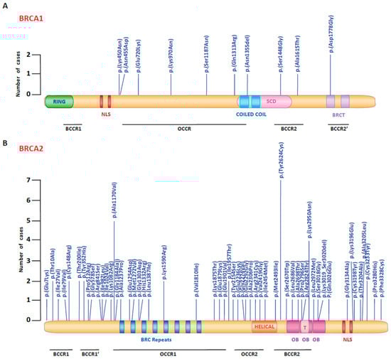 Subsequently, we mapped the BRCA1 and BRCA2 CIP/VUS alterations through the proteins’ binding regions and functional domain (Figure 3). In the BRCA1 gene, the 10 CIP/VUS variants were distributed along the entire gene sequence. Among these, the c.4063_4065delAAT deletion was located inside the coiled-coil domain, which binds to the WD 40 domain of the PALB2 gene. Among the BRCA2 gene, 30.1% variants were located in the BCCR regions and 36.4% of CIP/VUS alterations in the OCCRs. For BRCA2 protein, we found that two CIP/VUS alterations (c.7479G > A, c.7871G > A) were mapped in the DNA Binding Domain.