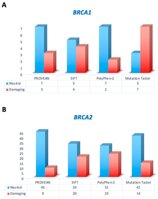 A limitation of the current study was the small size of the dataset of CIP/VUS alterations detected in the BRCA1 sequence. Consequently, we focused our next analysis on BRCA2 CIP/VUS mutations. When we considered the four approaches to predict the effect of the variants on the clinical outcome, a low consensus was achieved for the CIP/VUSs classified as damaging (8%), compared to neutral. The absence of agreement between the in silico tools can generate confusion in the interpretation of these variants. To this regard, there are studies with controversial results. Some of them suggested that the combination of different in silico algorithms may help to improve the prediction performance. Other researchers reported opposite data [,,]. In our study, a higher concordance was obtained (28.6%) when we used three of four in silico tools, suggesting that this approach may be more efficient than the previous one.
