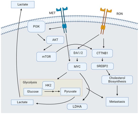 The MET family of RTKs consists of two members, MET and RON. These two receptors share 25% homology in their extracellular regions and 68% homology in their intracellular regions [7]. The respective ligands for MET and RON, hepatocyte growth factor [HGF] and hepatocyte growth factor-like protein [HGFL] share 43% homology [8,9,10]. Overexpression of either MET or RON is associated with worse patient prognosis in a variety of tumor types [11,12,13]. In addition to overexpression, MET can also influence tumor growth via over-activation, MET gene amplification, fusion of MET with another gene, or mutations that activate MET [14,15]. Recent research in cancer has identified a link between MET and RON and the development of pro-tumor metabolism [16,17,18]. This review summarizes the current knowledge of how the MET family induces pro-tumor metabolism and provides potential targets to limit MET family-driven cancer growth and metastasis.