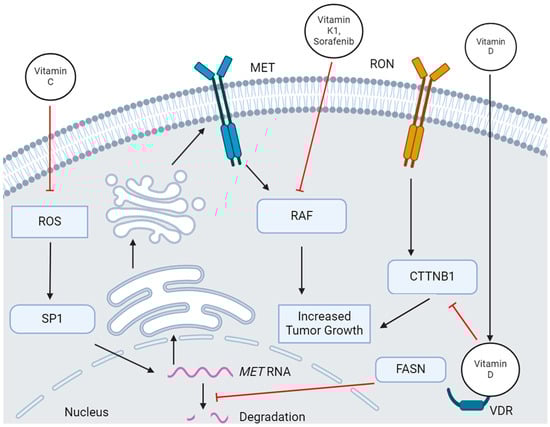 The activity of MET and RON are both affected by vitamins. Vitamin D3-induced activation of Vdr in the MMTV-RON-driven model of breast cancer leads to increased time to tumor initiation and decreased metastasis via inhibition of Cttnb1 downstream of RON signaling (Figure 2) [79]. Loss of Vdr in this model decreases active Cttnb1 levels and decreases time to tumor initiation. Inactivation of Cttnb1 by Vitamin D3 supplementation provides a potential alternative to statin treatment in limiting cholesterol biosynthesis. In contrast, activation of MET via HGF with the addition of Vitamin D inhibits growth in androgen-unresponsive prostate cancer cell lines [80]. The mechanism of action by which this growth inhibition occurs has yet to be elucidated. In some models, Vitamin D supplementation promotes HGF secretion leading to increased senescence and decreased tumor growth [81]. Although more research is required to understand the mechanism, the secretion of HGF induced by Vitamin D implies that HGF is a target gene of VDR. This points to the potential senescent effects of MET. Other researchers have observed no change in growth in mutant CTTNB1 MET-overexpressing hepatocellular carcinoma with the addition of Vitamin D [82]. This implies that the mechanism by which Vitamin D inhibits growth in both RON-expressing and MET-expressing cancers is via inhibition of CTTNB1.