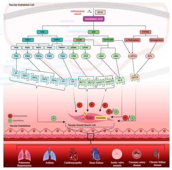 AA is a free fatty acid generated from the phospholipid membrane of endothelial cells and metabolized by cyclooxygenase (COX)-1 and COX-2 enzymes, expressed by PTGS1 and PTGS2 genes (characterized in Table 1), to generate pro-inflammatory thromboxanes (TX) through TXA2 synthase (TBXAS1 gene) and anti-inflammatory prostaglandins (PG) through PGE and prostacyclin synthase (PGI2; PTGES and PTGIS genes). AA is also metabolized by 5-lipoxygenase (LOX), 12-LOX, and 15-LOX to generate pro-resolutory lipoxins (LX) and pro-inflammatory leukotrienes (LT) through LTC4 synthase (LTC4S) and LTA4 synthase (LTA4H). Finally, cytochrome P450 (CYP) enzymes (e.g., CYP2J2, CYP2U1, EPHX1, EPHX2) metabolize AA to generate anti-inflammatory epoxyeicosatrienoic acids (EETs) and pro-inflammatory hydroxyeicosatetraenoic acid (HETEs). These generated mediators then act on their subsequent receptors (Figure 1) to induce vasoconstriction or vasodilation of vascular smooth muscle cells and propagate or attenuate an array of diseases in the human body.