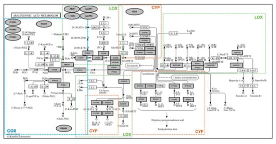 KEGG pathway map of arachidonic acid (AA) metabolism with boxed areas displaying genes for which expression has been quantified in this study. In each figure, differentially expressed AA metabolism enzyme-related genes are mapped to the KEGG pathway map in individual studies. Outlines demonstrate the area of cyclooxygenase (COX), lipoxygenase (LOX), and cytochrome P450 (CYP) metabolism, and their areas of overlap. Receptor-related genes are depicted on the periphery of the map as oval shapes. Expression levels are demonstrated as red (significantly higher expression), blue (significantly lower expression), or gray (non-significant change in expression), with significance expressed as p < 0.05.