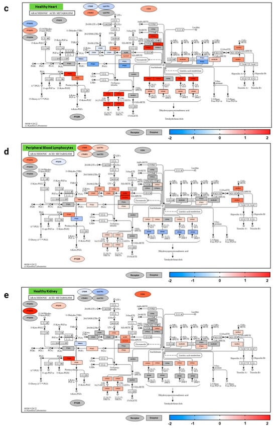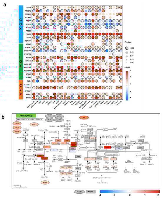 To evaluate the role of AA pathway genes and their expression in pulmonary, cardiovascular, and renal diseases, expression data were initially analyzed from healthy tissue across 26 different body sites from three individuals (Figure 4). In healthy human tissues, there was a diverse expression of the COX (PTGFR, PTGIR, PTGER2, PTGER3, PTGER4, PTGS2, PTGS1, PTGES, PTGIS, TBXAS1), LOX (LTB4R, LTB4R2, CYSLTR1, CYSLTR2, ALOX5, ALOX12, ALOX15, LTC4S), and CYP (FZD4, EPHX1, EPHX2, CYP2U1, CYP2J2, CYP4A11) pathway genes. COX genes, mainly producing anti-inflammatory and pro-inflammatory metabolites, were downregulated more than LOX or CYP genes, across organ systems. These results from our analysis affirm previous known roles of AA metabolites in physiological states [].