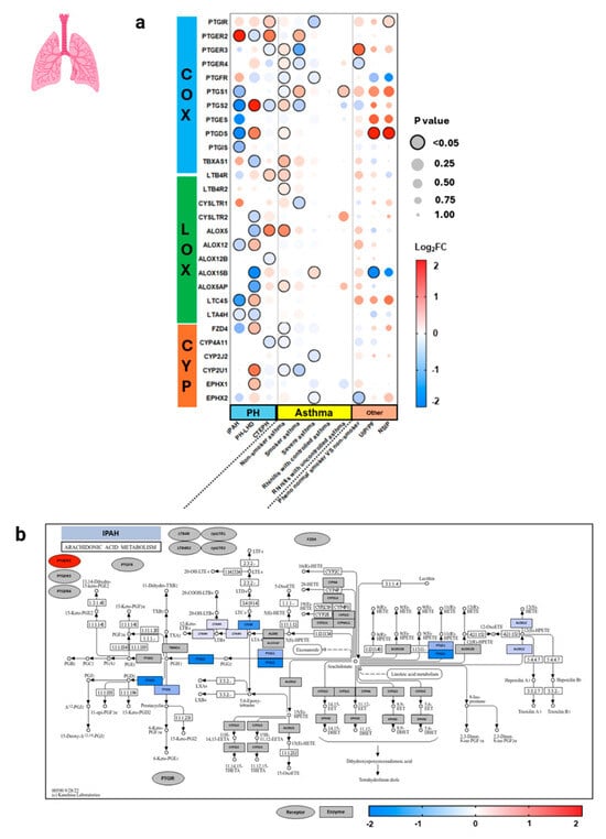 In pulmonary tissues (Figure 5), World Health Organization (WHO) group I idiopathic pulmonary arterial hypertension (IPAH) and group II PH due to left-heart disease (PH-LHD) demonstrated distinctly different patterns of AA metabolism. LOX and CYP pathway genes were significantly upregulated in PH-LHD, while IPAH demonstrated a greater significant downregulation in COX genes, as demonstrated in the pathway analysis. Interestingly, PTGER2, PTGS2, PTGDS, ALOX12, and LTC4S were inversely expressed in IPAH and PH-LHD, suggesting that divergent mechanisms are at play. Group 4 PH, chronic thromboembolic PH (CTEPH), also demonstrated inverse expression of PTGER2 and PTGS2 in a similar expression pattern to IPAH. Non-smoker asthma and smoker asthma demonstrated mild significant changes in diverse AA genes, while the other pulmonary disease states did not show many significant changes.