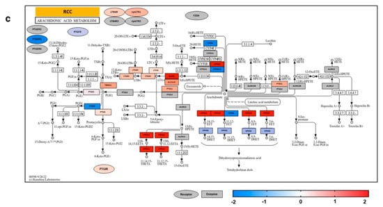 Within the diabetes group from renal tissue (Figure 7), there was quite an array of changes in expression, with renal glomeruli demonstrating upregulation of various COX, LOX, and CYP pathway genes. Interestingly, the tubulointerstitium of diabetic patients showed downregulation of anti-inflammatory CYP enzyme-related genes CYP4A11, EPHX1, and EPHX2. In diabetes, the tubulointerstitium and glomeruli of kidney tissue demonstrated upregulation of ALOX5 and ALOX5AP, and mostly downregulation of COX genes. Kidney biopsy from CKD patients shows upregulation of LOX-5 derived pro-inflammatory LT receptor-related genes cysLTR1, cysLTR2, and LTB4R2, as well as upregulation of LOX enzyme-related genes ALOX15B and ALOX12. In the renal cell carcinoma (RCC) group, the greatest increase is seen in RCC without comorbid obesity or smoking, as seen with upregulation of PTGS1, which aligns with current literature studying that COX-1 expression correlates with clinicopathological features of RCC. However, no significant changes were seen in COX-2 (PTGS2 gene) expression, despite COX-2’s well-established role in the inflammation-carcinoma sequence in various epithelial cancers []. RCC also demonstrates upregulation of ALOX5, TBXAS1, and cysLTR1, supporting literature on the role of TBXA2 in upregulating renal cancer and 5-LOX in progressing carcinogenesis [,].