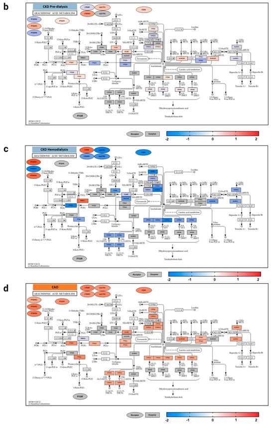 AA pathway genes were expressed more in CKD comorbidities and CAD compared to other conditions in PBMCs and blood samples (Figure 8). Specifically, CKD pre-dialysis demonstrated increased AA enzymes and receptors across all pathways. In contrast, CKD hemodialysis significantly downregulated most AA pathway genes, except for COX receptor-related genes PTGER2 and PTGER4, enzyme-related gene TBXAS1, and CYP receptor-related gene FZD4. The downregulation of genes from pre-dialysis to hemodialysis in CKD suggests contribution of AA metabolites in CKD inflammation. Additionally, CAD demonstrated remarkable increases in almost all select AA genes.