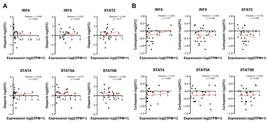 IRF/STAT family baseline expression does not correlate with sensitivity to olaparib or carboplatin in BRCA1/2 WT breast cancer cell lines. (A,B) Correlation analysis of each gene’s baseline expression versus olaparib sensitivity in 22 BRCA1/2 WT breast cancer cell lines, derived from DepMap Portal PRISM Repurposing screen data. Correlation analysis was conducted using Pearson correlation coefficient of gene expression versus olaparib or carboplatin responses (log2 fold change in abundance). Each dot represents a cell line, and the dashed red line indicates a linear regression line.