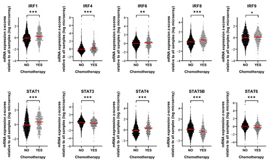 To assess the clinical relevance of our findings, we utilized METABRIC mRNA expression data [27,28] to compare the expression levels of specific genes in breast cancer patients with and without chemotherapy (including methotrexate, epirubicin, doxorubicin, and 5-fluorouracil) (Figure 4). Among the 16 IRF/STAT family genes we examined, 10 showed differential expression depending on chemotherapy exposure. IRF1, IRF4, IRF6, IRF8, IRF9, STAT1, and STAT4 were significantly upregulated following chemotherapy. In contrast, STAT3, STAT5B, and STAT6 were significantly downregulated. Interestingly, although IRF7 expression increased in many cell lines during acute interferon response activation by the cancer cells themselves (Figure 3A), no significant changes were observed in patient samples. Conversely, IRF1 and IRF9 expression levels showed increasing trends in both the acute cancer cell line dataset and patient samples (Figure 3A and Figure 4, respectively). STAT5B demonstrated an overall decrease after 24 h of cisplatin treatment in the cell line data (Figure 3A), and a similar decrease was observed in patient samples after chemotherapy (Figure 4). Collectively, these findings suggest that the expression of many IRF/STAT family genes, whose expression changed in cell lines, also changed in vivo after chemotherapy. These alterations likely have complex effects, influencing not only the interactions between cancer cells and their microenvironment, but also the survival signals within cancer cells.