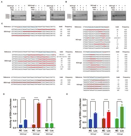(A,B): T7E1 enzyme cleavage detection of sgRNA cleavage efficiency on EE0.6 and NC_006127.4 (sg1, sg2, and sg3 all have cleavage activity, Marker: DL1000). (C): Actual mutation type of TA cloning sequence (reference: sgRNA sequence, the blue underline is the sgRNA sequence, and the red is the PAM sequence; WT: wild type; Indel: actual number of base changes; Frequency: frequency of mutations). (D,E): Luciferase SSA reporter vector detection of luciferase activity (the sg1 and sg2 groups have significantly higher fluorescent activity than the control group on the EE0.6 site, and there is no significant difference between the sg3 and the control groups because of lower mutation efficiency; the sg1 and sg3 groups have significantly higher fluorescent activity than the control group on the NC_006127.4 site, and the sg2 group has significantly higher fluorescent activity than the control group, **** p < 0.001).