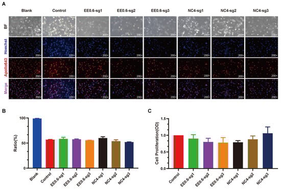 (A): EdU staining was used to detect the proliferative ability of DF-1 cells with EE0.6 and NC_006127.4 loci knocked out (200× magnification). (B): Bar graph showing the results of EdU staining for the proliferative ability of DF-1 cells with EE0.6 and NC_006127.4 loci knocked out. The ratio (%) was calculated as the number of Apollo643-stained cells divided by the number of Hoechst33342-stained cells. In comparison to the control group, there was no significant difference in the proliferative activity of the experimental group cells. (C): The CCK-8 assay was used to measure the viability of DF-1 cells with EE0.6 and NC_006127.4 loci knocked out. The proliferative activity of the experimental group cells, compared to the control group, showed no significant difference.
