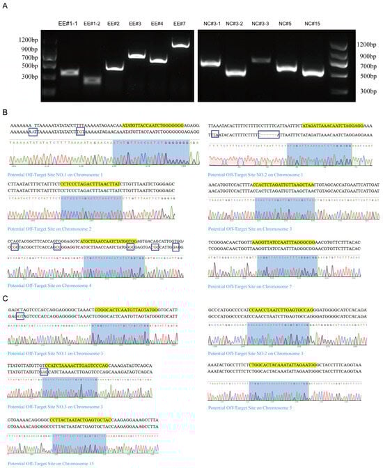 (A): Agarose gel(1%) electrophoresis to detect potential off-target site primer specificity (# is followed by the number of the predicted off-target site). (B): Sanger sequencing of EE0.6-sg1 potential off-target sites (blue letters represent base substitution, red represents base increase—represents base deletion, and yellow highlights are potential off-target site sequences). (C): Sanger sequencing of NC4-sg1 potential off-target sites (blue letters represent base substitution, red represents base increase—represents base deletion, and yellow highlights are potential off-target site sequences).