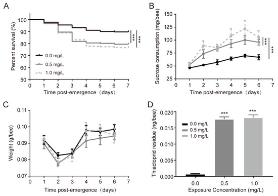 Impact of thiacloprid larvae exposure on the survival rate (A), sucrose intake (B), and body weight (C) of emerged adult honeybees over time. Thiacloprid residue of newly emerged bees within each treatment group (D). The sample size for each group is 4; all results are shown as the mean ± SE. *** p < 0.001.