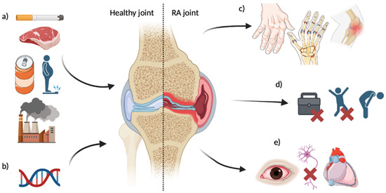 Overview of identified risk factors for RA development and disease impacts. (a) Lifestyle factors; (b) Genetic factors—see Table 1; (c) Affected joint impacts—may include deformity, swelling, pain, limited ROM [2]; (d) Quality of life impacts—may include cessation of work [4], lower functional ability, fatigue [1]; (e) Systemic impacts—may include eye inflammation [8], nerve compression [9], pericarditis [10]. RA risk factors and impacts are not limited to the above.