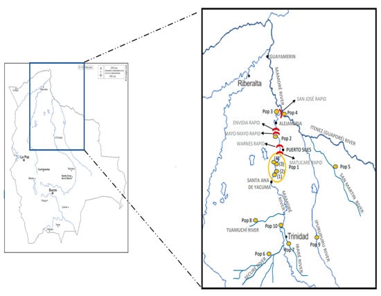 Figure 1. Map with the 10 Inia boliviensis populations sampled in the Mamoré and Iténez (Guaporé) rivers (Bolivia) for different molecular markers. Pop 1 = four sampling points (Porvenir, Bellaunión, Cerrito, and Iruyañez River mouth), all in the Mamoré River; Pop 2 = Bolivar (Mamoré River); Pop 3 = El Corte (Mamoré River); Pop 4 = El Azul (Iténez River); Pop 5 = San Martín River (Iténez River); Pop 6 = Securé River (Mamoré River); Pop 7 = Ibaré River (Mamoré River); Pop 8 = Tijamuchí River (Mamoré River); Pop 9 = Ipurupuru River (Iténez River); Pop 10 = mouth of Ibaré River with Mamoré River. The rapids in the Mamoré River are also shown on the map.