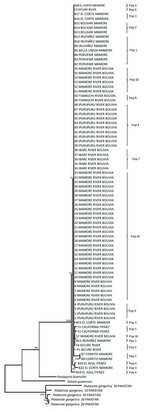 We sampled 82 bufeos in different rivers of the Mamoré sub-basin (Figure 1). In the main Mamoré River, 54 bufeos were sampled in four different areas. We named these areas as “populations” for operative purposes, but they are really sampling sites. However, these sampling sites belonged to very precise geographical areas, to different rivers, or were separated by different rapids. In fact, it is not very important to define a priori operating populations because later analyses (such as phylogenetic trees, AMOVA or BAPS) will determine exactly how many different populations there are. One was at the confluence of the Ibaré and Mamoré Rivers (latitude: −14.550, longitude: −65.003; 36 specimens). A second was in the middle of the Mamoré (−13.445, −65.235) and included four sampling points that were close together that were not separated by geographical barriers. These were Porvenir, Bellaunión, Cerrito, and the confluence of Iruyañez River with the Mamoré River. Ten specimens were collected. The third was in Bolivar (−12.393, −65.159; 3 specimens). The fourth was El Corte (−11.925, −65.054; 5 specimens). In addition, some bufeos were sampled in three affluent tributaries of the Mamoré River. They were the Securé River (−15.333, −65.020; 3 specimens), the upper Ibaré River (−14.333, −64.900; 5 specimens), and the Tijamuchí River (−14.450, −65.900; 2 specimens). In the main Iténez (Guaporé) River, 2 specimens were sampled at a place named El Azul (−11.972, −65.036). Bufeos were also sampled in two affluent tributaries of the Iténez (Guaporé) River—the San Martín River (−13.300, −63.417; 2 specimens) and the Ipurupuru River (−14.302, −65.050; 14 specimens). An important fact is that the Middle Mamoré is separated from Bolivar by two rapids (Cachuela Matucaré and Cachuela Warnes). Similarly, Bolivar is separated from El Corte by two rapids (Cachuela Mayo—Mayo and Cachuela Envidia). El Corte is separated from El Azul by one rapid (Cachuela San José). Thus, we want to know if these rapids influence the genetic structure of I. boliviensis in the Bolivian rivers.