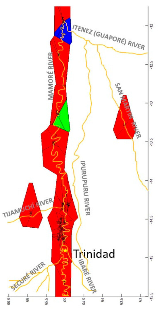 The Mamoré sub-basin (611,800 km2) covers 66.7% of the Upper Madeira River Basin and includes 47.7% of its volume and has a length of 1930 km [50]. The Mamoré River is a typical whitewater river, containing a considerable amount of small particles and inorganic suspended solids that limit water visibility. The hydrological pattern is closely related to precipitation, showing a unimodal curve with a high-water period between December and April and a low-water period from June to October. Fluctuations in water level of up to 10 m result in flooding of the forest or surrounding area [51].