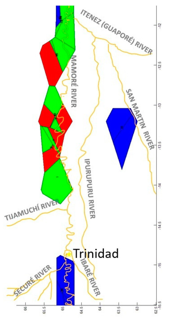 Figure 7. Different populations of bufeos (I. boliviensis) detected by means of BAPS in Bolivian rivers using DQB-1 gene sequences. Twenty-three (23) specimens were analyzed, and four populations were detected.