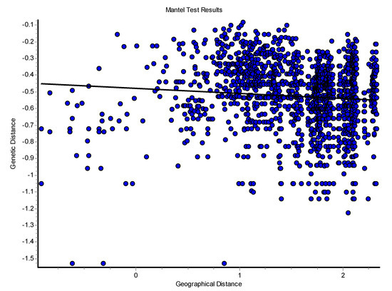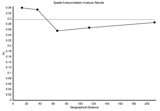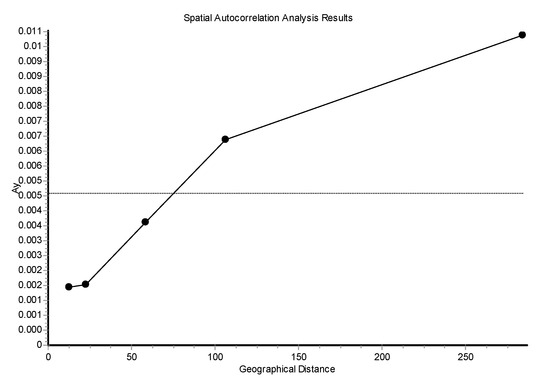 101. Bertorelle, G.; Barbujani, G. Analysis of DNA diversity by spatial autocorrelation. Genetics 1995, 140, 811–819. [Google Scholar] [CrossRef]