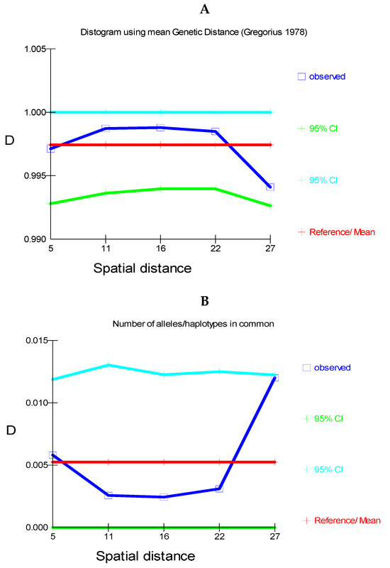 For CR, two additional methods were carried out. First, we created distograms based on Gregorius’s genetic distance and the common shared haplotypes for the specimens of the Bolivian bufeos studied [96,97]. Five DCs were used. The significance of distograms and autocorrelation coefficients were calculated by means of 10,000 Monte Carlo simulations [98], with an estimated confidence interval of 95% [99]. We used the SGS v1.0d software to determine the significance of these autocorrelation coefficients [100]. Second, we used AIDA as a second spatial autocorrelation procedure [101] with the II and cc statistics, using 10 populations for CR. To connect the geographic localities within each distance class, we used the Gabriel–Sokal network [102,103,104] and Delaunay triangulation with elimination of the crossing edges [105]. The Bonferroni and Kooijman tests [106] were applied to determine the significance of the autocorrelation coefficients. Six DCs were used in this analysis.