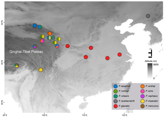 - Tao, R.; Xu, C.; Wang, Y.; Sun, X.; Li, C.; Ma, J.; Hao, J.; Yang, Q. Spatiotemporal differentiation of alpine butterfly Parnassius glacialis (Papilionidae: Parnassiinae) in China: Evidence from mitochondrial DNA and nuclear single nucleotide polymorphisms. Genes 2020, 11, 188. [Google Scholar] [CrossRef]